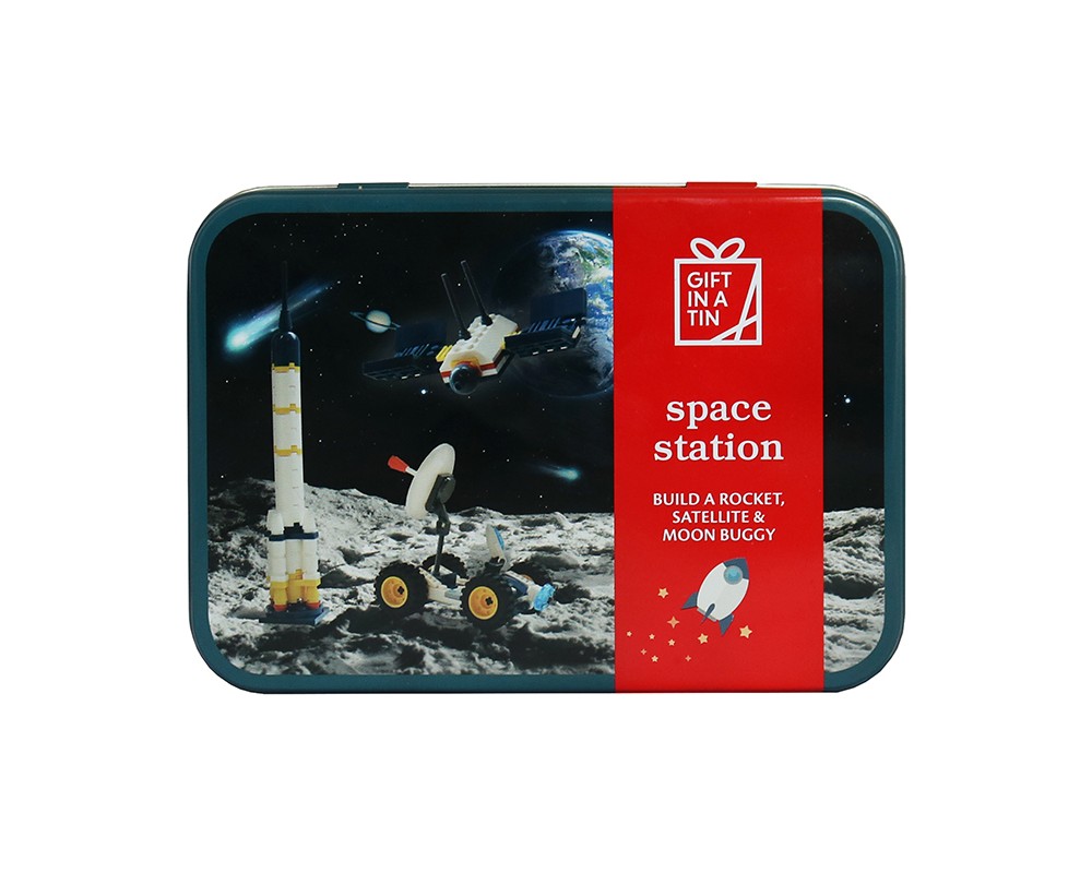 Peltisessä lahjarasiassa on kaikki, mitä pieni avaruuden tutkija tarvitsee rakentaakseen avaruusraketin, satelliitin ja kuuauton. Osat kestävää muovia, selkeät kuvitetut ohjeet englanniksi. Rasian koko 10 x 14,5 x 5,5 cm. Ikäsuositus 6 vuotiaasta alkaen.