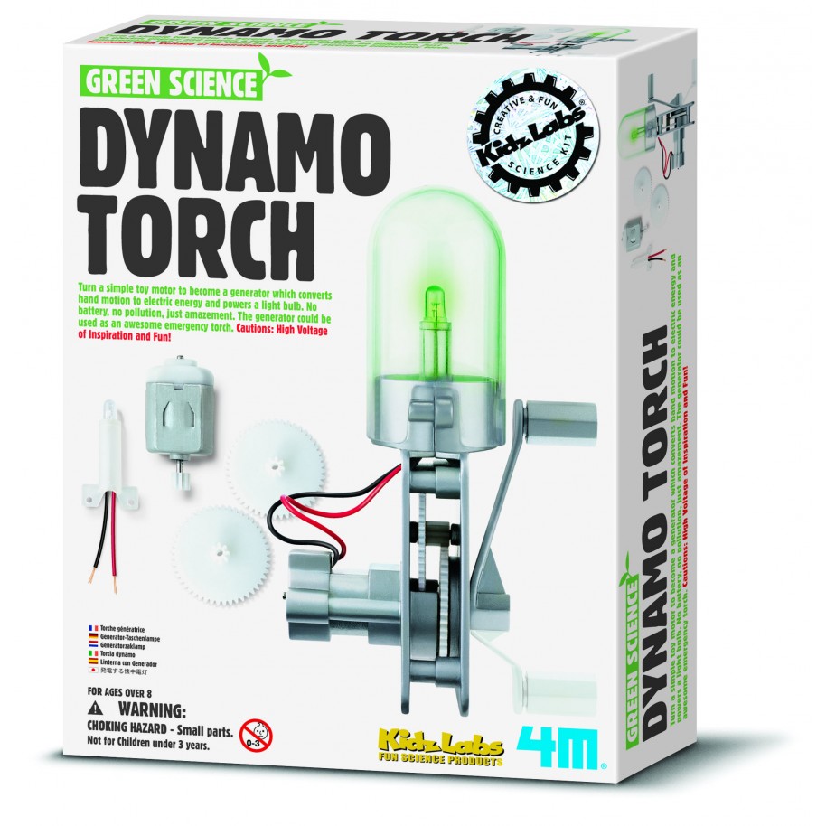 Muokkaa yksinkertainen moottori generaattoriksi, joka käden liikkeestä syntyvän energian sähköenergiaksi, joka antaa voimansa hehkulampulle. Setissä on mukana kaikki tarvittava: moottori, hammasrattaat, LED -hehkulamppu sekä muovinen kotelo. Muita osia tai tarvikkeita ei tarvita, ei myöskään paristoja – toki ristipääruuvimeisselin toivotaan löytyvän kotoa. Erittäin hyvä rakennussetti nuorelle tieteestä kiinnostuneelle – dynamolampun rakentamalla oppii paljon uusiutuvasta energiasta ja luontoystävällisestä teknologiasta. Laadukasta 4M -tiedesarjaa, selkeät ohjeet englanniksi. Lampun kokonaiskorkeus 12 cm. Ikäsuositus alkaen 8 v. Ei alle 3-vuotiaille pienten osien vuoksi.