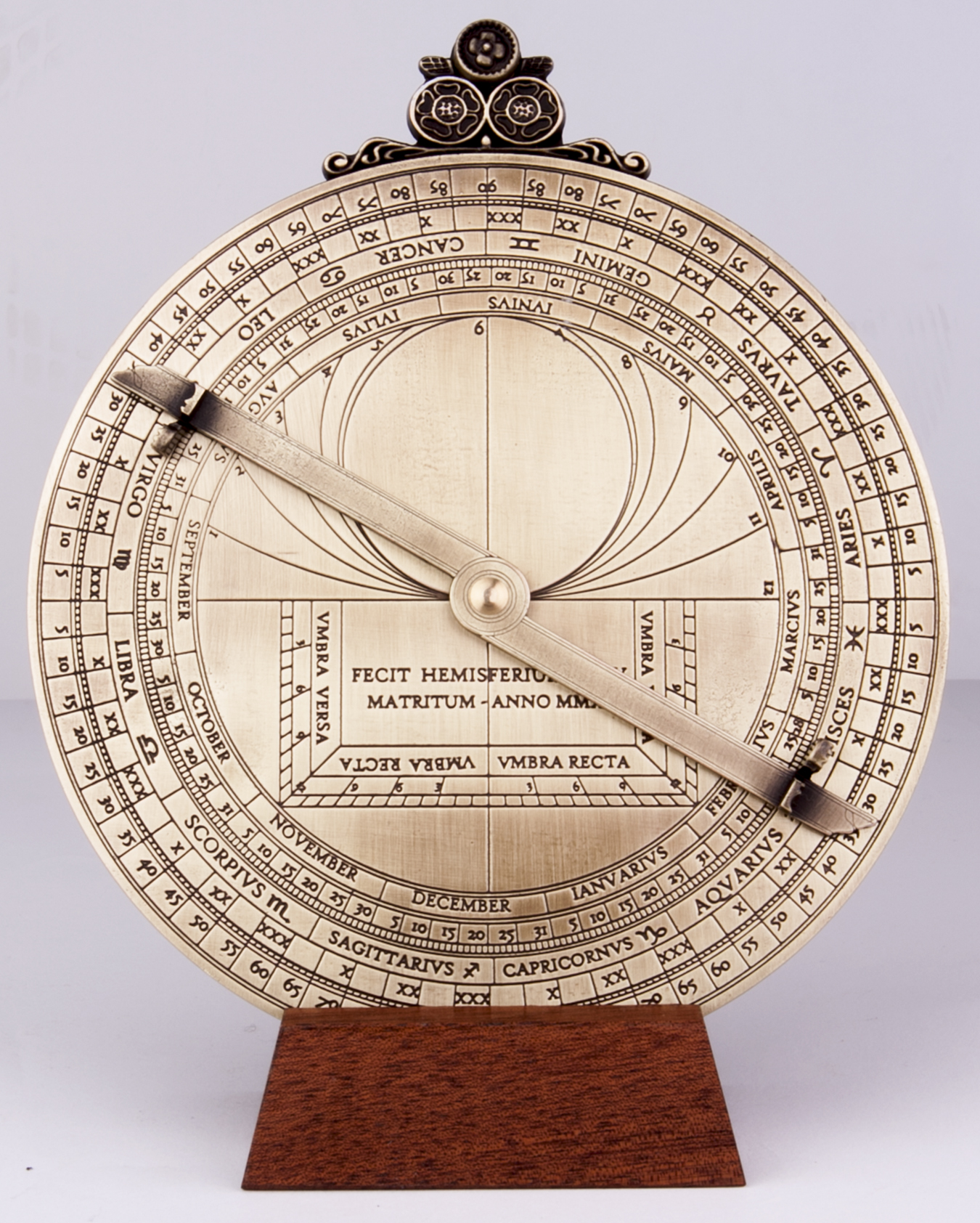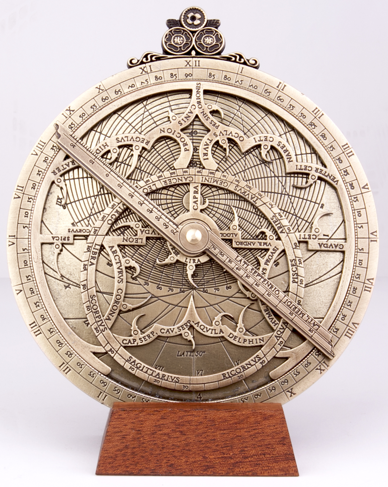 Saksalainen Geog Hartmann suunnitteli tämän upean astrolabin 1532, alkuperäinen instrumentti on esillä British Museumissa. Hartmann (1489-1564) oli renessanssiajan yleisnero: insinööri, instrumenttien valmistaja, kirjailija, kirjanpainaja, humanisti, kirkonmies ja tähtitieteilijä. Hänen verstaassaan Nürnbergissä valmistettiin mm. aurinkokelloja, kvadrantteja ja astrolabeja. Tämä astrolabi on täysin toimiva, ja sen mukana tulevat yksityiskohtaiset käyttöohjeet sekä historiikki englanniksi ja espanjaksi. Astrolabin korkeus 190 mm, kiekon halkaisija 150 mm ja paksuus 8 mm. Jalopuisen jalustan ansiosta astrolabin saa näyttävästi esille.