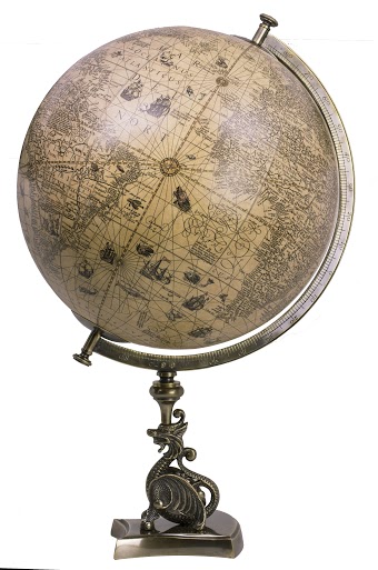 Karttapallo on parhaimmillaan myös sisustuksen kohokohta ja tunnelmantekijä. Tässä hienostuneessa karttapallossa on kartografi Jodocus Hondiuksen (1563-1612) laatima kartta. Tumman pronssin hohtoinen metallimeridiaani kiinnittyy jalustassa olevaan metalliseen tyyliteltyyn lohikäärmeeseen. Karttapallo on valmistettu kuten varhaiset esikuvansakin: pallon ympärille on käsin liimattu paperisuikaleille painetut kartat, minkä jälkeen pinta on käsiteöty mattalakalla. Karttapallon halkaisija 32 cm, kokonaiskorkeus 53,5 cm. Toimitusaika noin kaksi viikkoa.