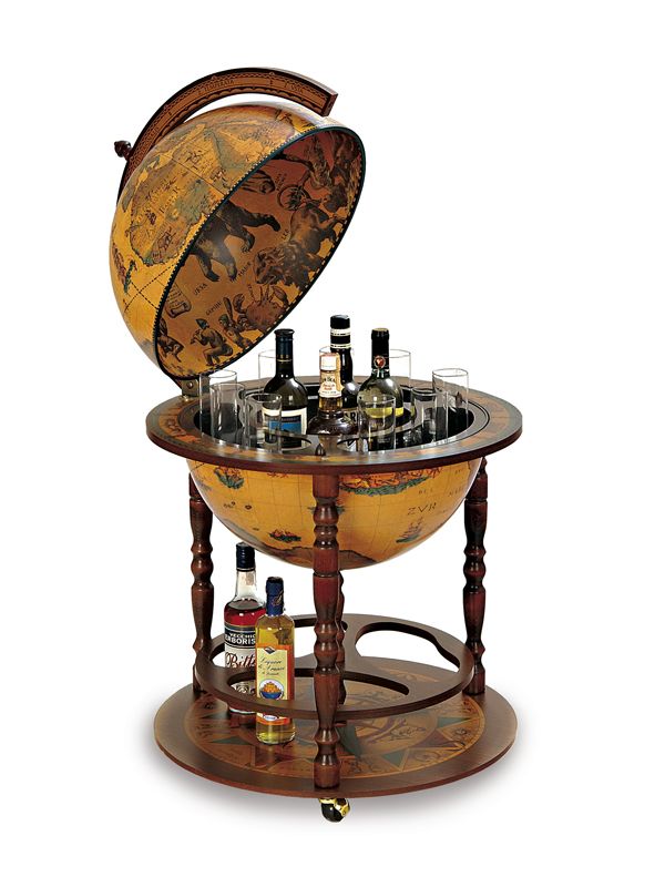 Karttapallobaari, joka tarjoaa edustavuutta ja tyyliä tarjoiluun. Jalustan pyörien ansiosta Ancona toimii myös tarjoiluvaununa. 50-senttiseen palloon mahtuu laaja valikoima lempijuomia sekä laseja, ja pulloille on lisää säilytystilaa jalustan hyllyllä. Lämpimän punasävyistä vuodelta 1696 peräisin olevaa antiikkikarttaa kannattelee kokopuinen kehys ja puolimeridiaani. Korkeus 91 cm, karttapallon halkaisija 50 cm ja kokonaisleveys 60 cm. Toimitusaika noin viikko.