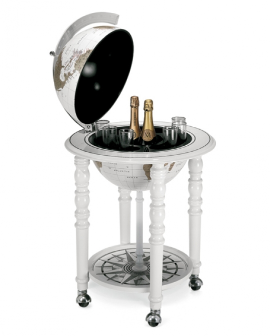 Perinteistä muotoilua ja modernia väritystä – tämä karttapallobaari sopii erinomaisesti skandinaaviseen sisustukseen! Karttapallossa on täysin ajantasainen maailmankartta, minkä lisäksi se kätkee sisäänsä 2-3 pulloa ja jopa 9 lasia. Jalustan kompassiruusulla koristetulla alatasolla on lisäksi säïlytystilaa useammille juomille. Kantavat rakenteet puuta, kahvana toimiva meridiaani kirkasta akryyliä. Italialainen laatutuote. Karttapallon halkaisija 40 cm, leveys 50 cm ja kokonaiskorkeus 90 cm. Toimitusaika noin kaksi viikkoa.