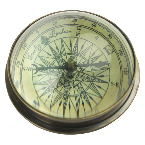 Puolipallon muotoisen lasikuvun alla on kaunis toimiva kompassi. Se on hauska katseenvangitsija työpöydällä ja hyödyllinen suunnannäyttäjä. Lasikupu on aavistuksen verran vihertävä, ja sitä kiertää antiikkityyliin tummaksi viimeistelty pronssikehys. Pohjassa on suojaavaa huopaa. Kompassin halkaisija 8 cm.