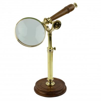Perinteinen pronssinhehkuinen suurennuslasi, jossa on rokokoo-koristekuvioitu metallikahva. Tukevasti kehystetty linssi suurentaa noin viisinkertaisesti. Pysyy hyvin kädessä ja on kaunis koriste työpöydällä – tai siellä missä sitä kulloinkin tarvitaan! Suurennuslasin pituus 13 cm, halkaisija 5,3 cm.