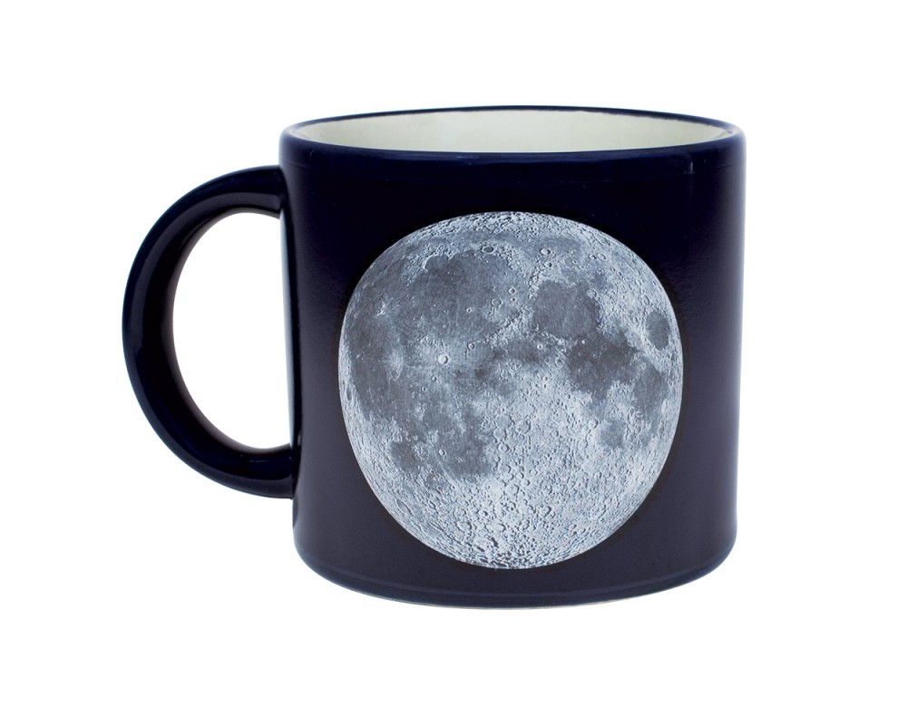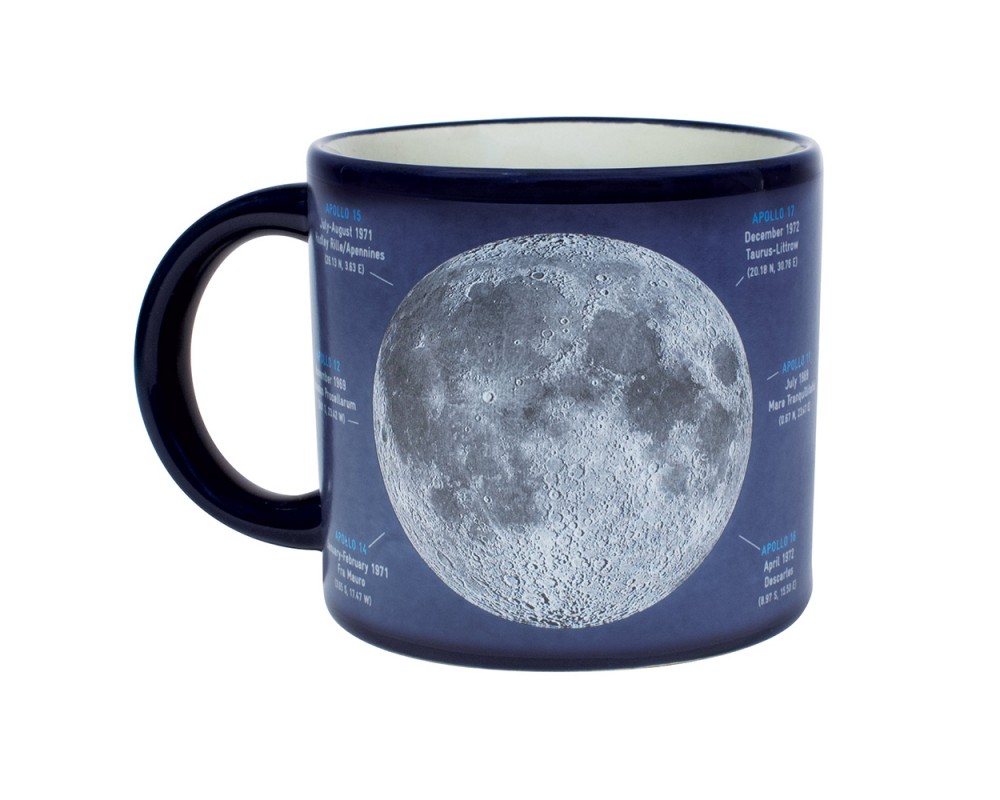 Oivallinen muki kaikille Kuun ystäville. Tyhjänä tai kylmiä juomia juodessa mukissa näkyy Kuun molempien puoliskojen karttakuvat. Kun lisäät mukiin lämmintä juomaa, Kuun ympärille alkaa kertyä tietoa Apollo -kuulennoista, mukana olleista astronauteista sekä laskeutumispaikoista. Muki kestää mikroaaltouunin, mutta ei konepesua. Vetoisuus noin 4 dl, mukin korkeus 10 cm. Toimitetaan lahjapakkauksessa.