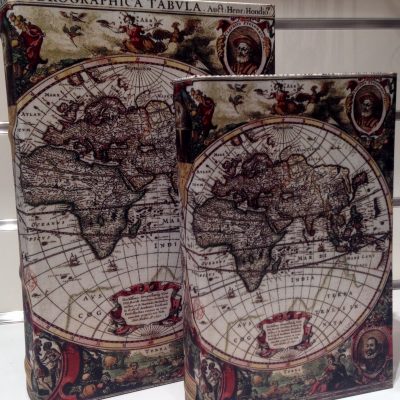 Tunnelmallinen neljän lasinalusen setti korkkitaustoitettua kivitavaraa. Yhdessä nämä lasinaluset muodostavat kuvan vanhan ajan tunnetusta maailmankartasta. Lasinalusten halkaisija 10 cm.