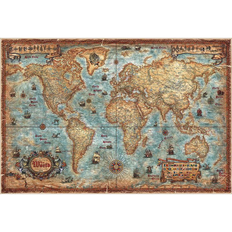 Todella upea antiikkisen tyylinen mutta täysin ajantasainen maantieteellinen ja valtiollinen maailmankartta. Runsaan paikkanimistön lisäksi kartassa on kuvattu muun muassa kylmät ja lämpimät merivirrat sekä meridiaanit. Meriä koristavat löytöretkien ajan purjelaivat, ja saattaa sieltä löytyä jokunen merihirviökin. Kartta on koristeltu signaalilipuin ja Morsen aakkosin. Suuri koko takaa selkeän luettavuuden. Koko 136×92 cm.