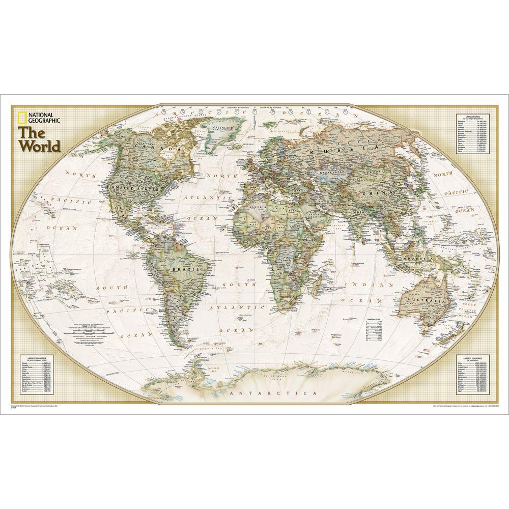 Hillityn pastellisävyinen maailmankartta antaa vaikutelman menneiden aikojen kartoista, mutta on karttatiedoiltaan täysin ajantasainen. Taattua National Geographic -laatua: paljon paikkatietoja ja laadukas painotyö. Kartan koko 81 x 51 cm, sopii tavallisiin julistekehyksiin.