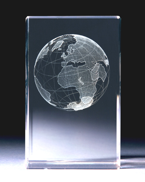 Maa leijuu tässä hohtavassa kristallikuutiossa aivan kuin avaruudessa. Tarkkaa laserkaiverrustyötä. Kristallin koko 80 x 50 x 50 mm, toimitetaan pehmustetussa lahjarasiassa.
