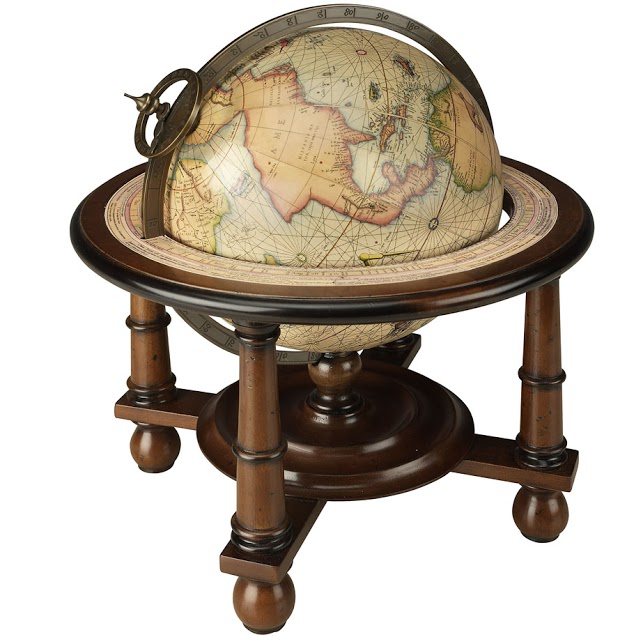 Koristeellinen karttapallo merenkulkijan tai maailmanmatkaajan työpöydälle. Hienostuneeseen saksanpähkinäpuiseen jalustaan on liitetty Mercatorin vuoden 1541 karttapallo, jonka valmistuksessa on käytetty alkuperäisiä painolaattoja. Ekvaattorikehässä on astemerkinnät, ja kokonaisuuden viimeistelee pronssinsävyinen kokomeridiaani. Kartapallon halkaisija 26,5 cm, kokonaiskorkeus 30 cm.