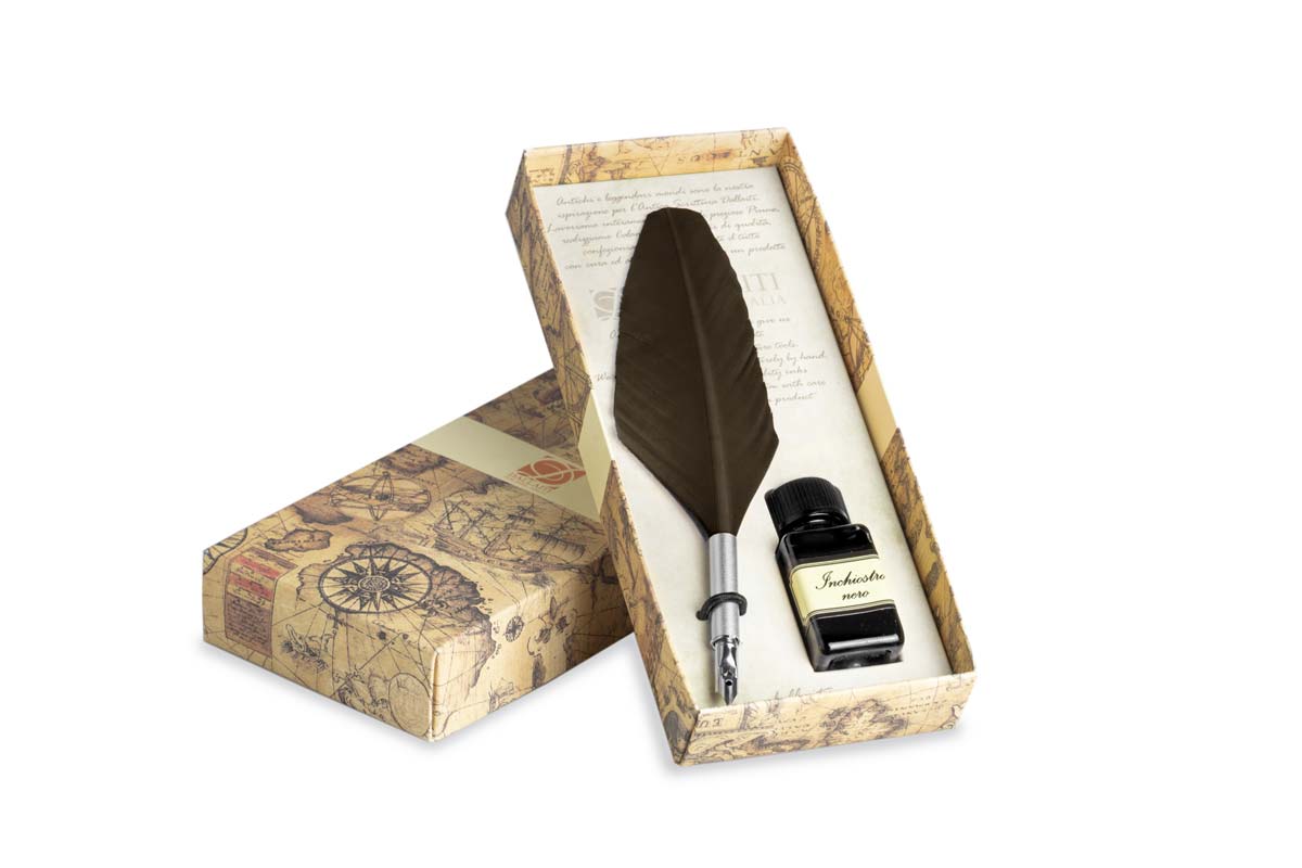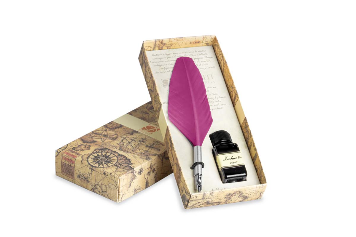 Laadukas kalligrafiateräinen sulkakynä ja musta muste kauniissa lahjapakkauksessa. Kynä sopii pienemmänkin kalligrafistin käteen, sillä sulkakynän pituus on 16 cm. Pakkauksen koko 18 x 8 x 2,8 cm. Valmistaja italialainen Dallaiti. Sulkakynän värivaihtoehdot ovat oranssi, pinkki, tummanruskea ja violetti. Liikkeessämme on usein muitakin värivaihtoehtoja, ota yhteyttä ja kysy lisää!