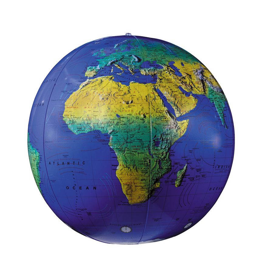 Vaikuttavan näköinen 68–senttinen puhallettava karttapallo. Väritys vastaa kasvillisuusvyöhykkeitä, mukana myös runsaasti paikkatietoja. Pallo on tehty kestämään käyttöä, ja se soveltuu erinomaisesti esityksiin, opetus– ja havaintovälineeksi sekä peleihin ja leikkeihin.