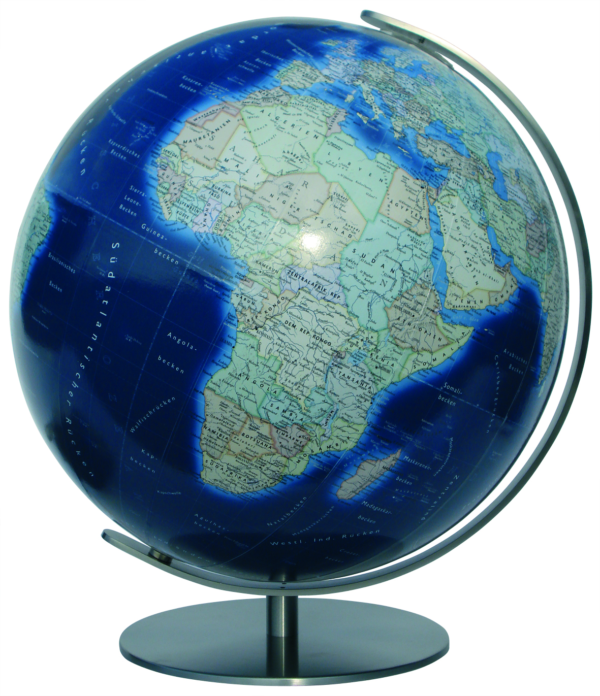 Syvän safiirinsininen karttapallo 40-senttisenä mallina. Ilman valoa karttanäkymässä korostuvat pastellisävyisinä valtiot, ja valon kanssa karttanäkymä muuttuu geofyysiseksi: esiin tulevat kasvillisuusvyöhykkeiden lisäksi maanpinnan korkeuserot kolmiulotteisena vaikutelmana. Sama kolmiulotteisuus näkyy myös merenpohjissa. Laadukas ja näyttävä kokonaisuus. Jalusta ja meridiaani ovat himmeäksi harjattua terästä. Englanninkielinen. Karttapallon halkaisija 40 cm ja kokonaiskorkeus 52 cm.