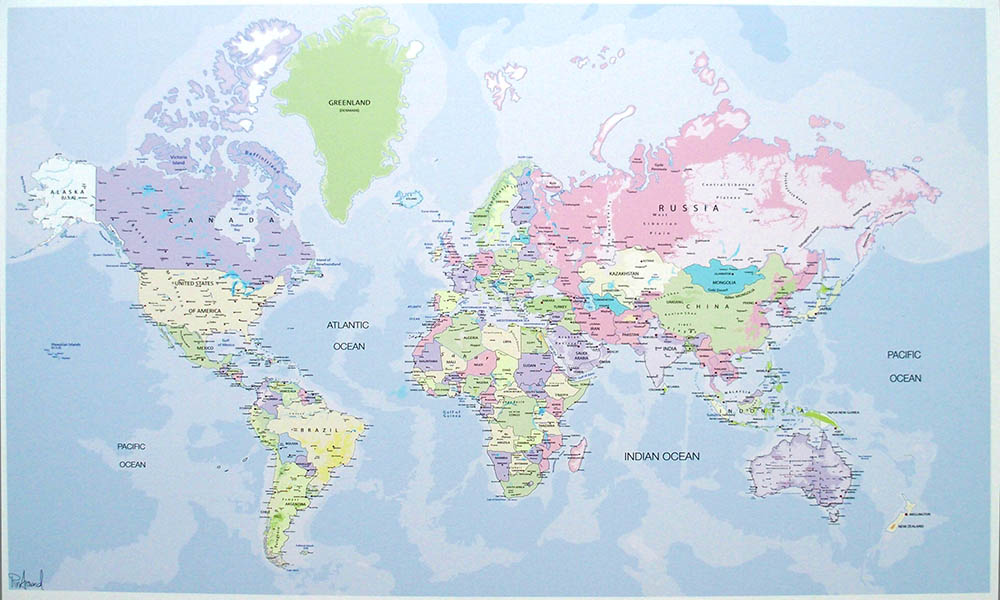 Tyylikäs sinimerinen karttakuva on painettu suoraan kierrätyskuidusta valmistetulle levylle ja valmis ripustettavaksi seinälle. Merkitse karttaneuloilla maat, joissa olet käynyt – tai haluat käydä! Valtioiden ja kaupunkien nimet auttavat löytämään oikeat paikat neuloille. Karttaneuloja voit tilata erikseen, niitä myydään 25 kappaleen pusseissa eri värisinä. Tämä maailmankartta pysyy kauniisti pystyssä seinään nojaamallakin, mutta saat mukana ripustuskoukut seinäkiinnistystä varten. Kartan koko 70 x 42 x 1 cm.