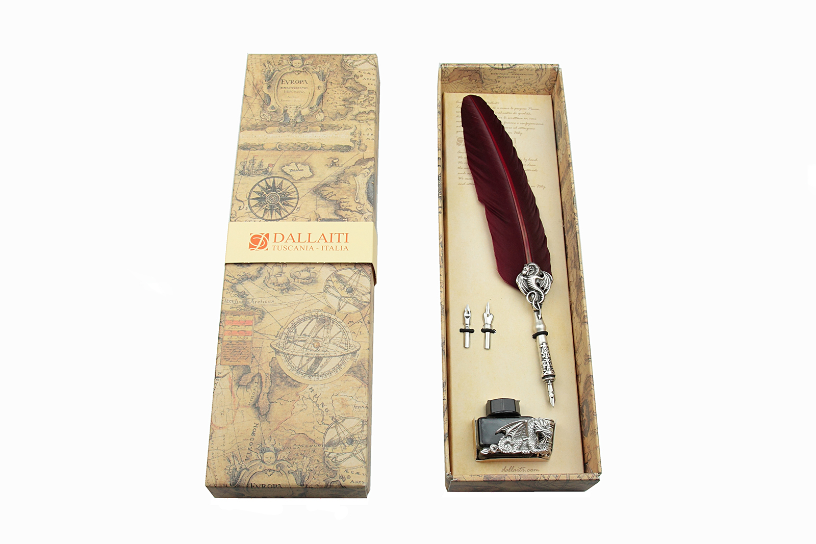 Näyttävä sulkakynäpakkaus, jossa on lohikäärmeen kuvalla ja metallivarrella koristeltu sulkakynä, kolme erilaista kalligrafiaterää sekä mustaa mustetta sisältävä lohikäärmekoristeinen mustepullo, jossa on myös kynänpidike. Sulkakynän pituus noin 30 cm, pakkauksen koko 37 x 11 x 5 cm. Valmistaja italialainen Dallaiti. Sulkakynässä kaksi värivaihtoehtoa: musta ja tummanpunainen. Liikkeessämme on usein muitakin värivaihtoehtoja. Ota yhteyttä niin kerromme mitä!