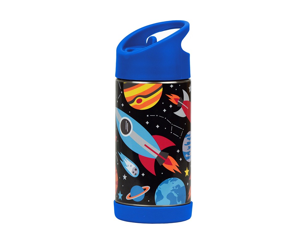Laadukkaassa teräksisessä termospullossa pysyvät pienen astronautin juomat kuumana – tai kylmänä – jopa 12 tunnin ajan! Kätevä juomanokka helpottaa juomista reissun päälläkin. Tilavuus 3,5 dl, korkeus 17,5 cm.