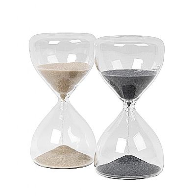 Kaunis moderni tiimalasi lasia. Hiekan valumisaika noin 12 minuuttia. Saatavana neljänä raikkaana värivaihtoehtona: tiilenpunainen, luonnonvaalea, antiikkikulta ja hopeanharmaa. Tiimalasin korkeus 15 cm, halkaisija 7,5 cm.