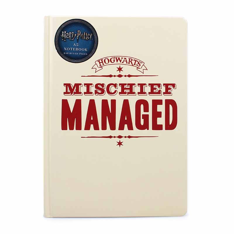 Kun kelmien karttaa napsautti taikasauvalla ja lausui samalla ’ilkityö onnistui’ (mischief managed), se muuttui jälleen tavalliseksi pergamentin palaksi. Mitähän tapahtuu, kun tätä Tylypahkan muistikirjaa napauttaa taikasauvalla? Muistikirjassa on 240 viivoitettua sivua tukevasta paperista, ja jokaista niistä koristaa kulmassa Harry Potter -logo. Koko A5 eli 21,5 x 15 x 1,8 cm. Sopii mainiosti velhokoululaiselle!